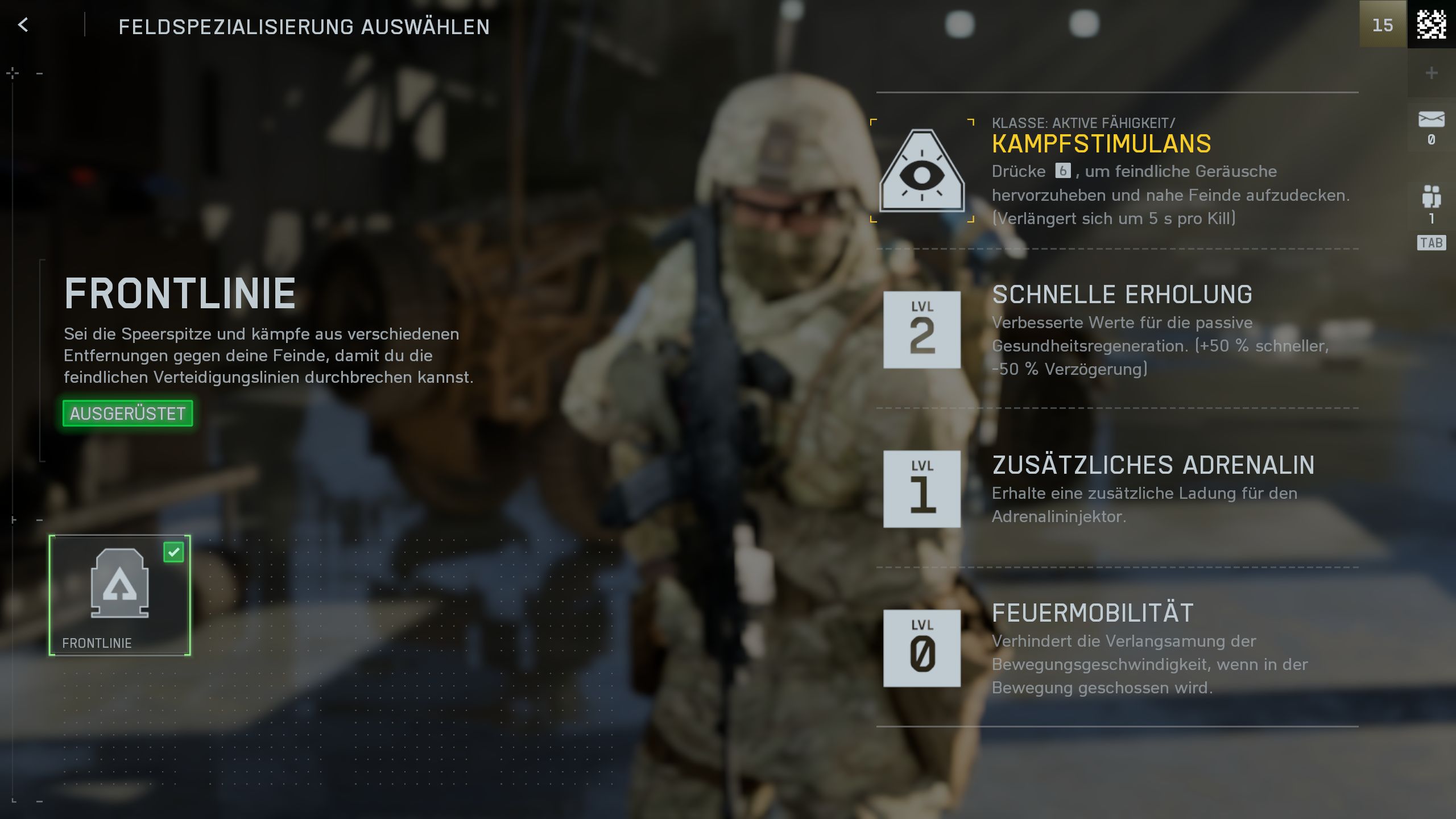 Kampfstimulans: Hebt feindliche Geräusche hervor und deckt nahe Feinde auf. Die Wirkung verlängert sich um 5 Sekunden pro Kill.