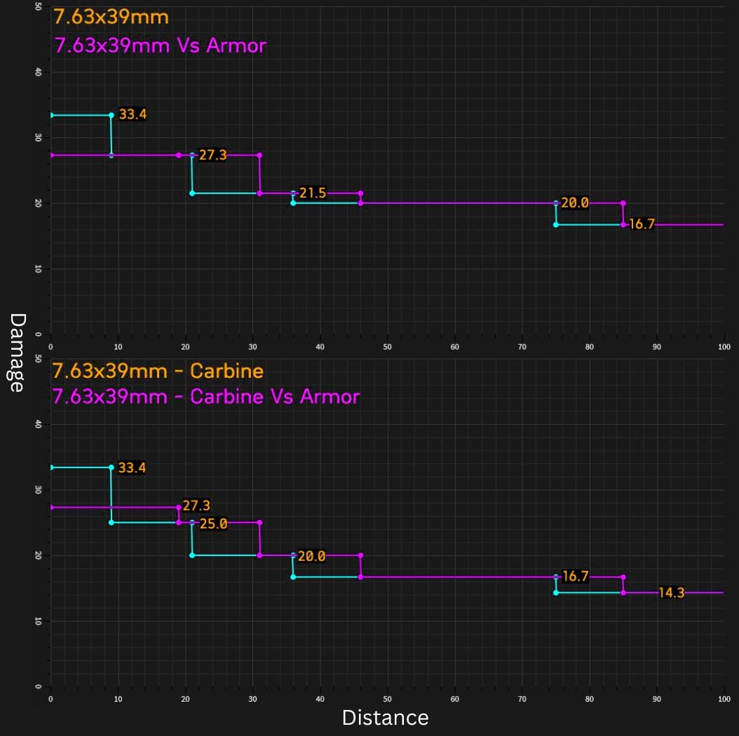 Das Update zeigt dies anhand des 7.62x39mm-Kalibers. Die Schadensschritte beginnen bei 33.4 Schaden im Nahbereich, sinken stufenweise über mehrere Reichweiten ab und verändern sich in REDSEC durch den 10-Meter-Rangeshift gegen Armor. Die Carbine-Variante folgt denselben Grundwerten, verliert aber im Nahbereich gegen Armor ebenfalls die erhöhte Schadensspitze.